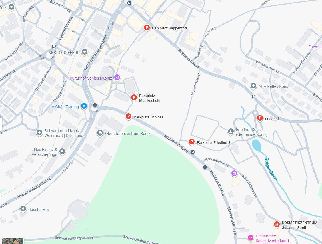 Die Parkplätze beim Friedhof Köniz sind wenige und nur für wenige Stunden (für Trauung wird es reichen)